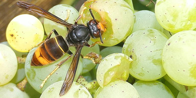 • Asiatische Hornisse frisst an Weintrauben – Foto: Jörg Tilmans/NABU-naturgucker.de