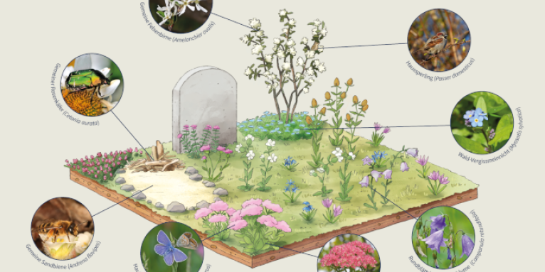 Ob Alleen mit altem Baumbestand, dichte Hecken, Efeuranken oder historische Mauern – viele Friedhöfe bieten wertvolle Lebensräume für Tiere wie Vögel, Insekten und Kleinsäuger. Auch die Bepflanzung der Gräber trägt zur biologischen Vielfalt bei. Zwischen Stiefmütterchen und Geranien wachsen mitunter auch Fette Henne, Wilde Karde oder Buschwindröschen.